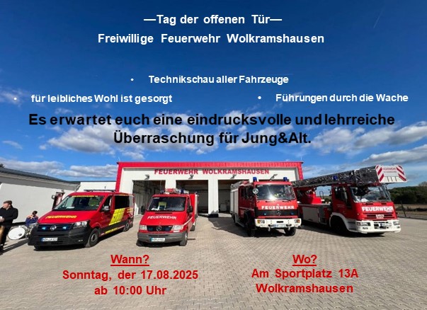Die Feuerwehr Wolkramshausen läd am 17.8.2025 um 10:00 Uhr zum Tag der offenen Tür.